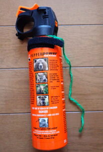 ↓ 今回 私が購入したベアスプレー (緑色の毛糸は簡易風向計として使うために付けています)